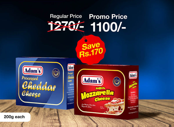 Save big on purchase of this smart deal containing Adam's Cheddar and Buffalo Mozzarella Cheese 200 gm blocks.