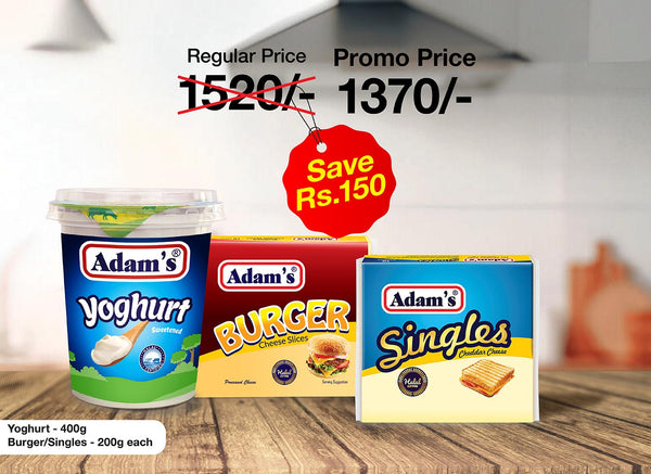 Adam's gives you the solution to your snack time cravings with Adam's Yoghurt 400gm, Cheddar Singles 200gm and Burger Slices 200gm, and that too with a good saving.